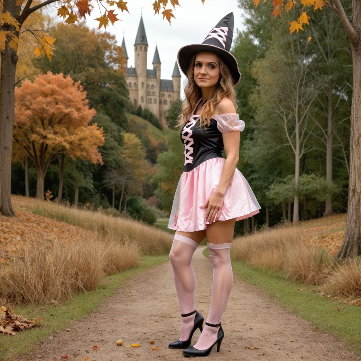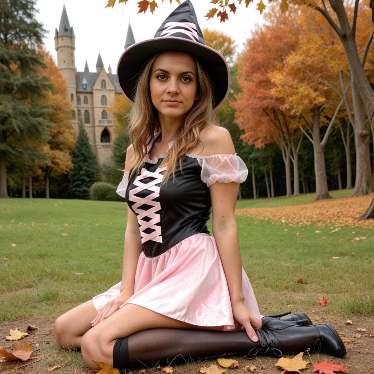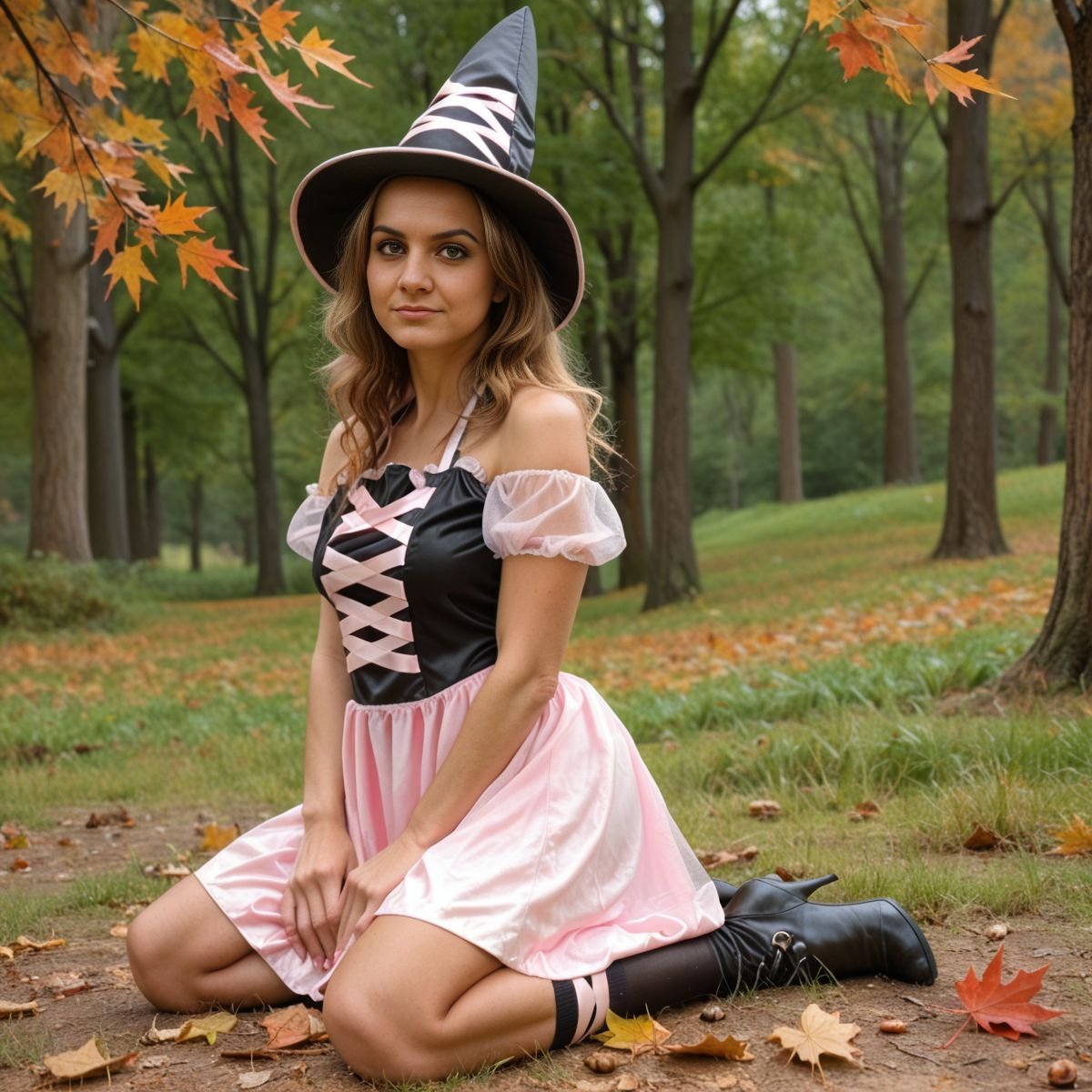 Cool October sunlight spills through the Forbidden Forest, hitting the clearing with a crisp glow. Hogwarts is a distant smudge, but Hermione Granger’s not buried in books today. Her pink and black witch costume laughs at her usual robes, nothing like what Hogwarts girls wear. The black top, pink laces tied tight, grips her tits, bare shoulders gleaming in the chilly air. The pink skirt rides high, black panties flashing with every step. Her legs go on forever, ass barely covered, and the witch hat sits crooked on her wild curls. Getting caught out here would mean hell, but that danger just makes her grin.