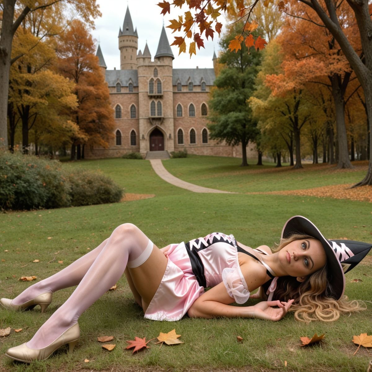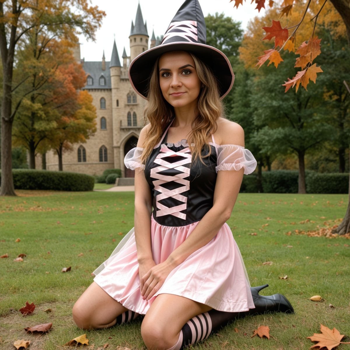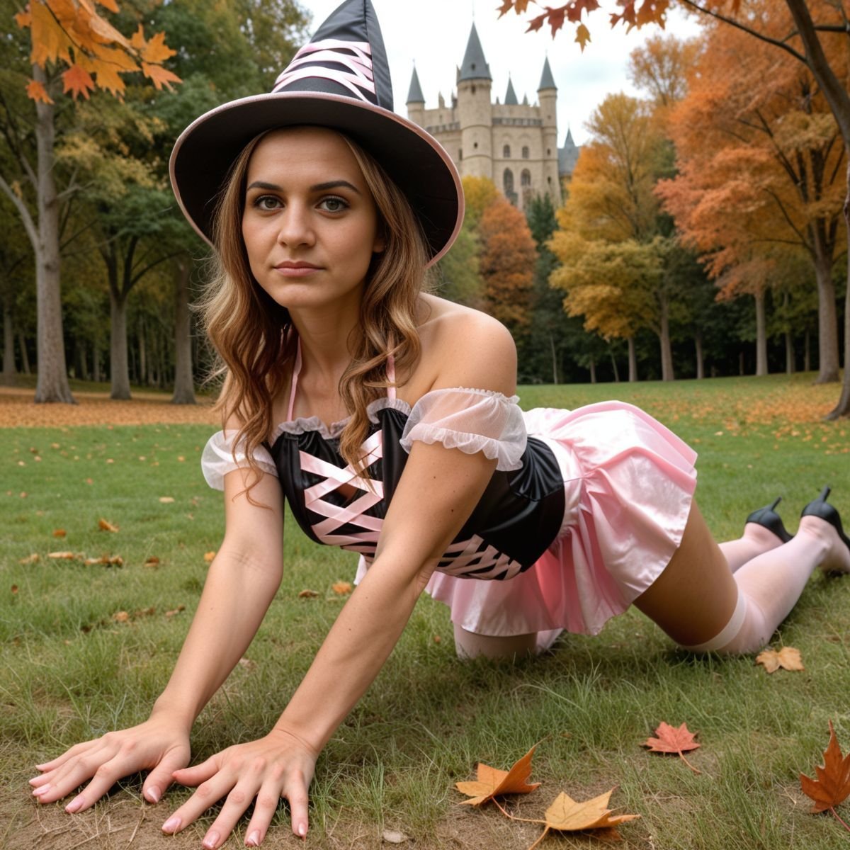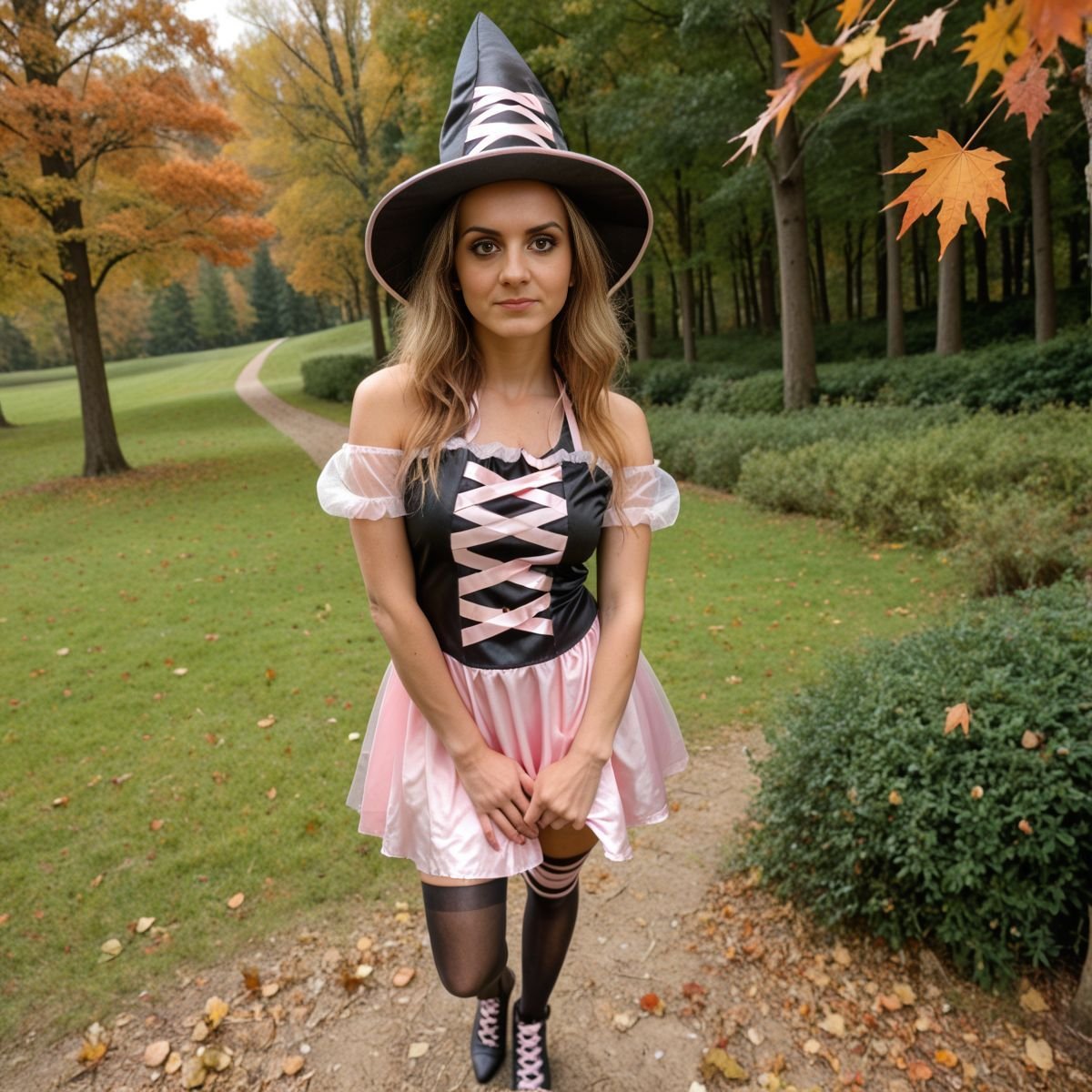 Cool October sunlight spills through the Forbidden Forest, hitting the clearing with a crisp glow. Hogwarts is a distant smudge, but Hermione Granger’s not buried in books today. Her pink and black witch costume laughs at her usual robes, nothing like what Hogwarts girls wear. The black top, pink laces tied tight, grips her tits, bare shoulders gleaming in the chilly air. The pink skirt rides high, black panties flashing with every step. Her legs go on forever, ass barely covered, and the witch hat sits crooked on her wild curls. Getting caught out here would mean hell, but that danger just makes her grin.