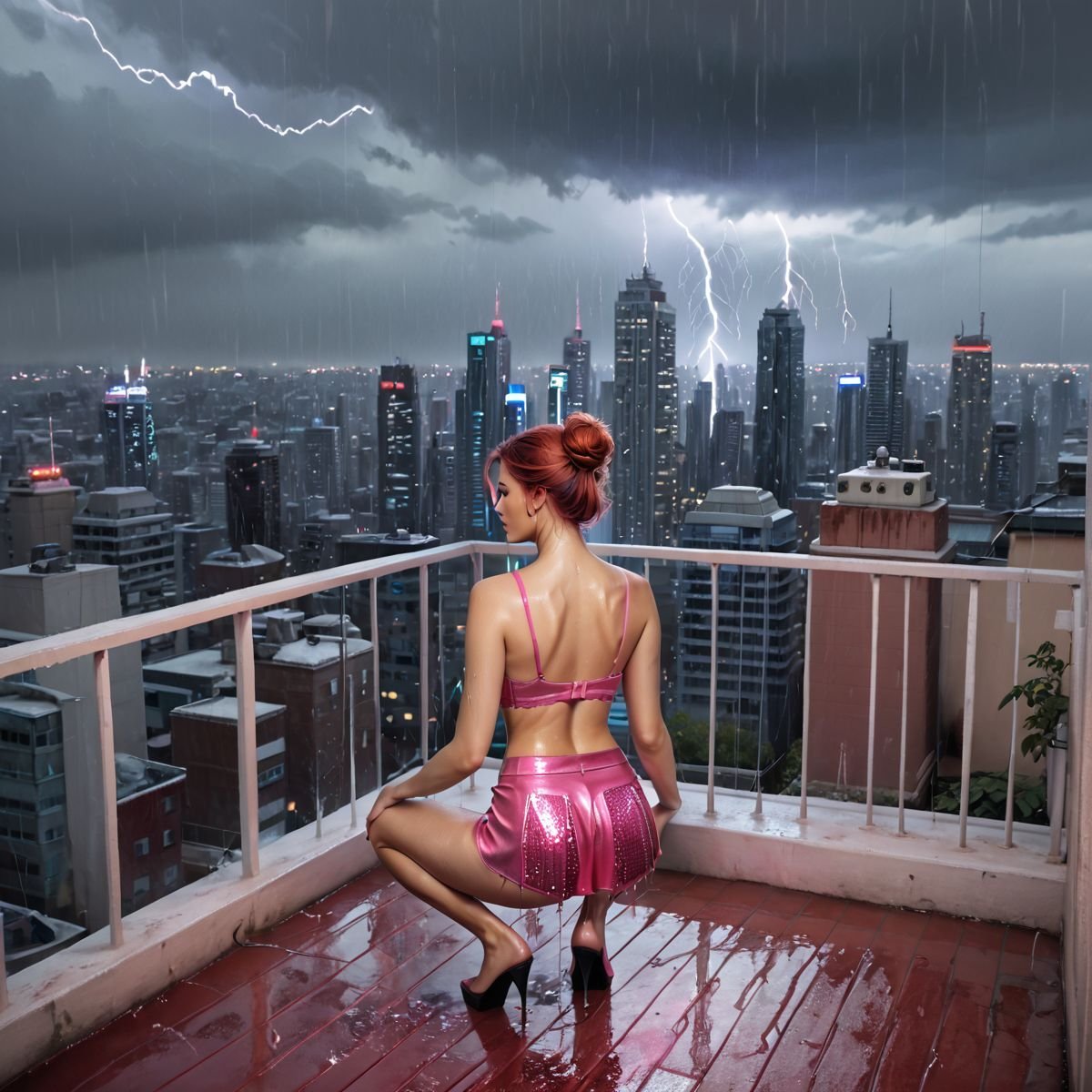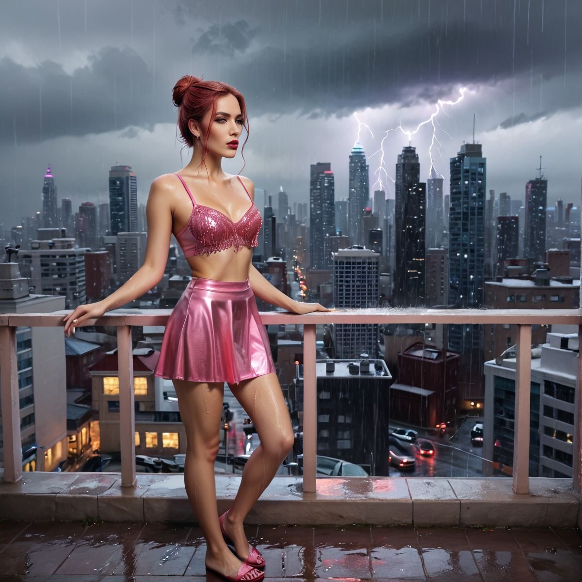 Lightning lit her up, her silhouette sharp against the glass railing, lips wet and eyes bold. Raven moved slow and easy, hips swaying as she spun, arms out to catch the rain. The hula skirt swished, bright against her pale, wet skin. Up there, alone above the city, she was in her element, her body feeling the storm’s wild vibe—a hot, teasing dance with the rain and thunder.