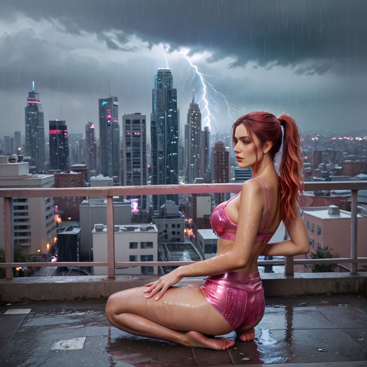 A gust of wind flipped the skirt’s fronds, flashing her strong thighs for a second. Raven laughed, a low, sexy sound that mixed with the thunder. Her fingers grazed the skirt’s edge, not too far, just enough to tease the fabric, letting it dance with the wind. The rain came down harder, plastering the pink skirt to her body, outlining every inch—her full chest, her hips, her round ass. The drops clung to her skin, making her shine under the stormy sky.