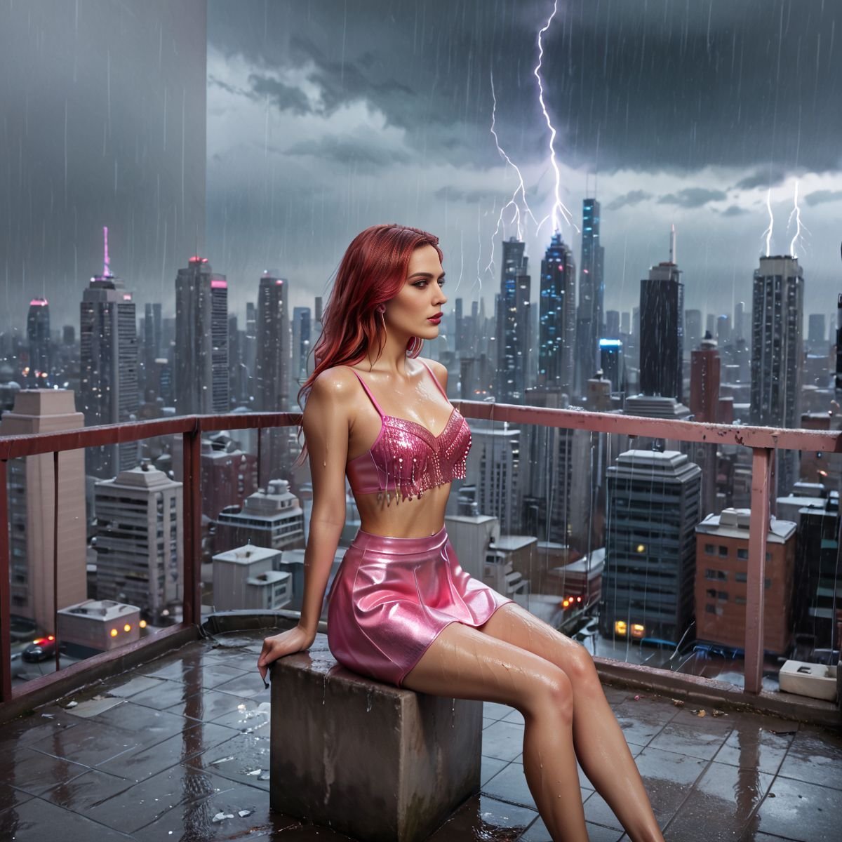 A gust of wind flipped the skirt’s fronds, flashing her strong thighs for a second. Raven laughed, a low, sexy sound that mixed with the thunder. Her fingers grazed the skirt’s edge, not too far, just enough to tease the fabric, letting it dance with the wind. The rain came down harder, plastering the pink skirt to her body, outlining every inch—her full chest, her hips, her round ass. The drops clung to her skin, making her shine under the stormy sky.