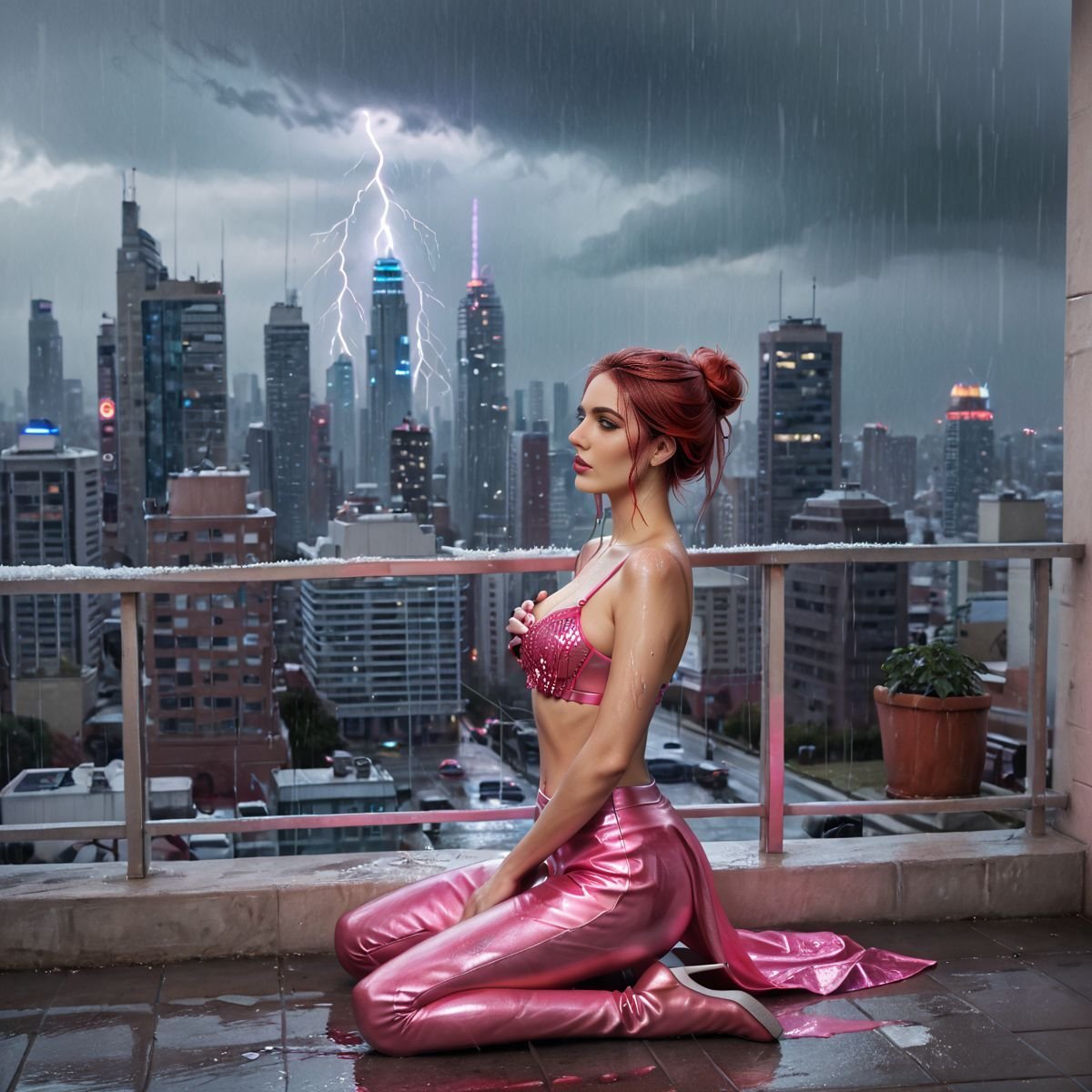Lightning lit her up, her silhouette sharp against the glass railing, lips wet and eyes bold. Raven moved slow and easy, hips swaying as she spun, arms out to catch the rain. The hula skirt swished, bright against her pale, wet skin. Up there, alone above the city, she was in her element, her body feeling the storm’s wild vibe—a hot, teasing dance with the rain and thunder.