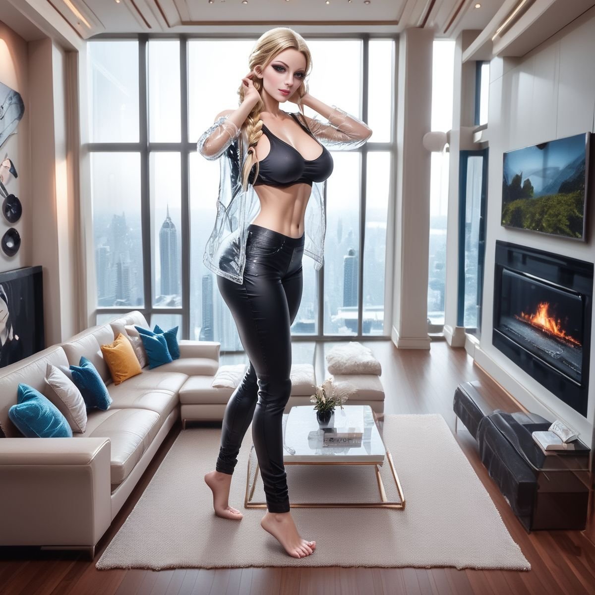 I stood up, my long blonde hair cascading down my back like a river of gold. I adjusted my position, making sure every angle was perfect before giving myself a sly wink in the mirror. My eyes sparkled with mischief as I began to undress, revealing inch by delicious inch of skin that seemed to glow in the soft lighting.